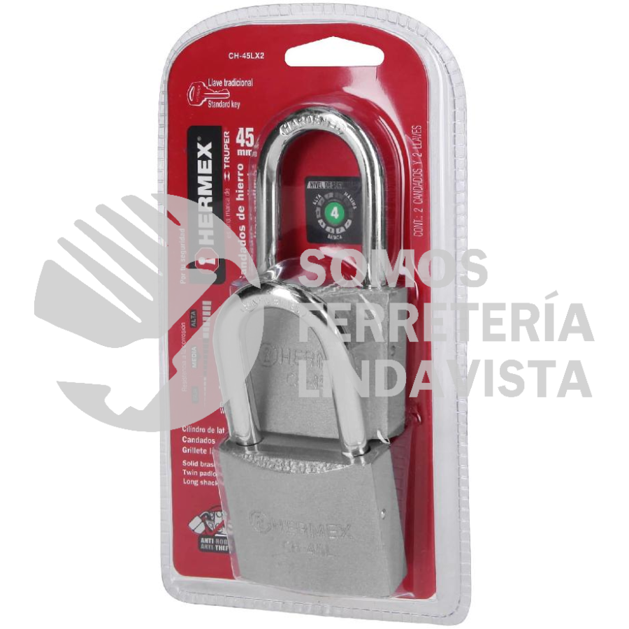 43330 CH-45LX2 BLISTER CON 2 CANDADOS DE HIERRO DE 45MM CON GANCHO LARGO HERMEX
