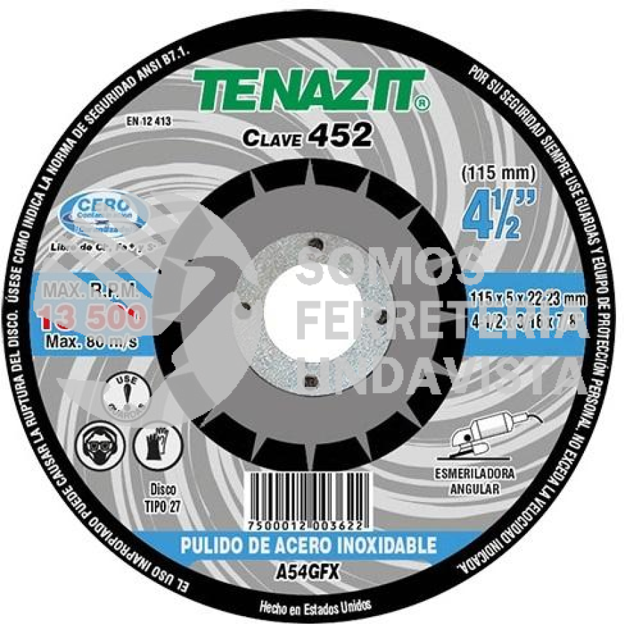452 DISCO CON CENTRO DEPRIMIDO PARA PULIDO DE ACERO INOXIDABLE TIPO 27 GRANO 54 (4-1/2"X3/16"X7/8") TENAZIT