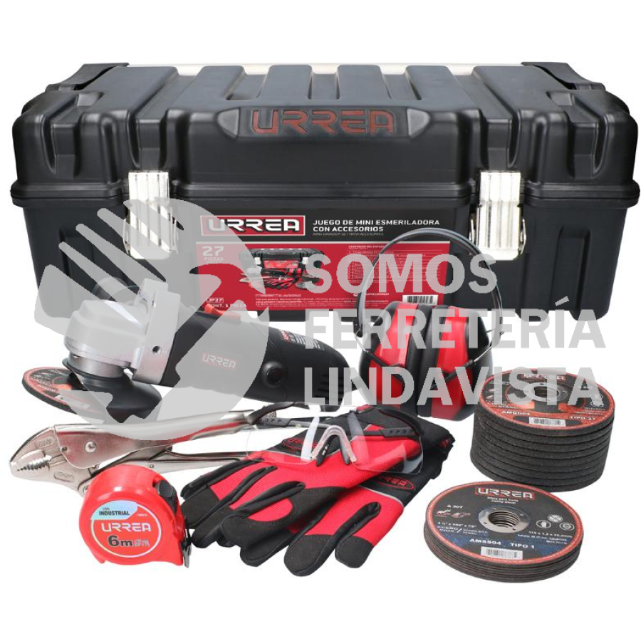 Caja plástica 21x11x10" - 1pz. Mini esmeriladora 4-1/2" 900W - 1pz. Disco t/27 metal4-1/2x1/4"gral - 10pz. Disco t/1 inox 4-1/2x3/64"gral - 10pz. Guante mecánico uso gral G - 1pz. Lentes seg Sport transp - 1pz. Orejera ajustable 30 dB - 1pz. Pinza presión cva 10" cte - 1pz. Flexómetro indust 6mx25mm - 1pz.
