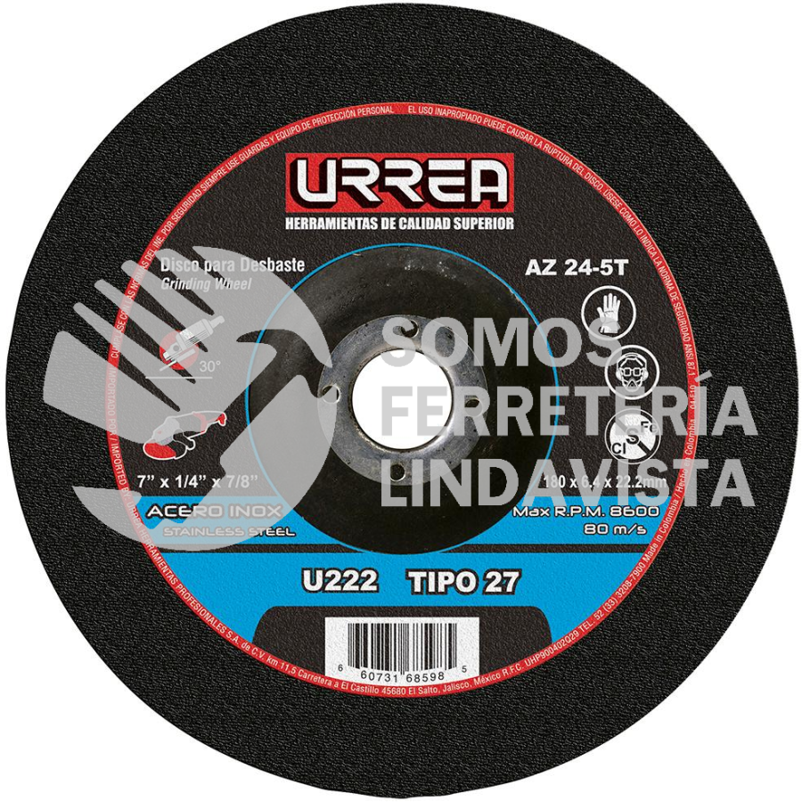 U222 DISCO ABRASIVO TIPO 27 PARA ACERO INOXIDABLE 7X1/4"X7/8" USO MEGA PESADO URREA
