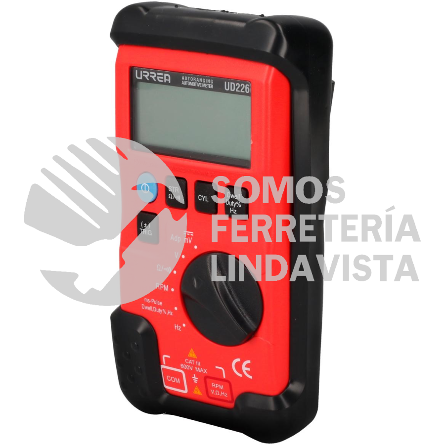 -Multímetro digital automotriz 600 VCD/600 VCA profesional Urrea. -Funciones: voltaje CD/CA, resistencia, RPM ms-pulde, Dwell,% Duty cycle, frecuencia y continuidad.. -Incluye puntas de prueba y recolector inductivo para RPM.. -Funda de protección con soporte.